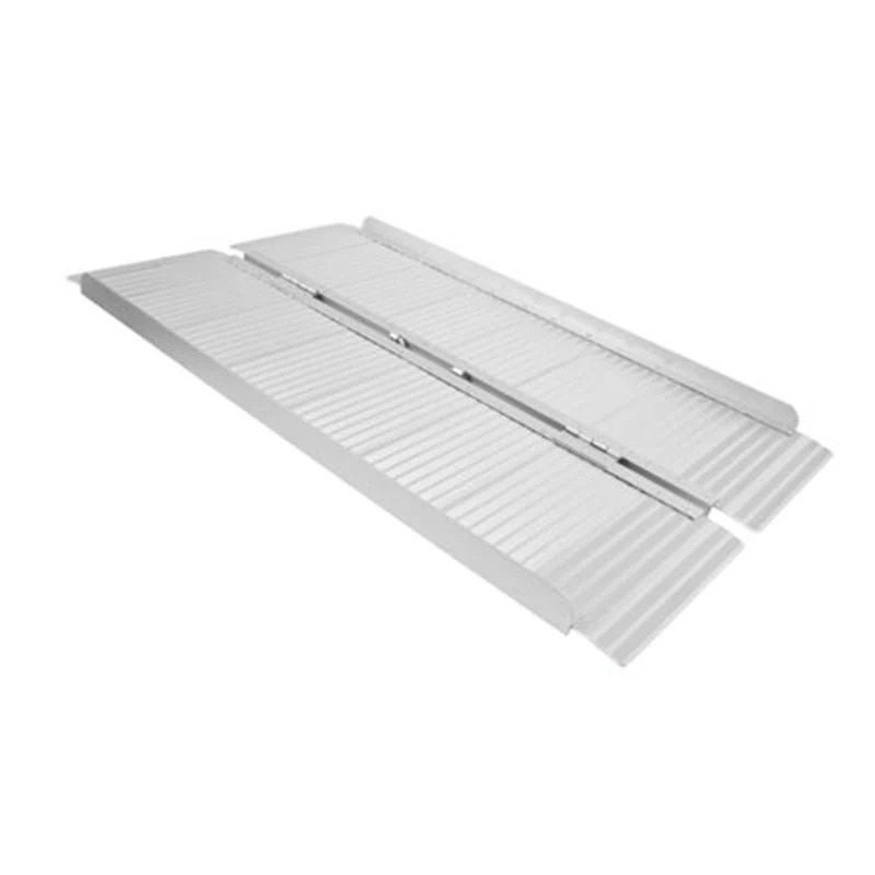 Aluminiumrampe mit gerillter Oberfläche und Tragegriff. Die Rampe ist längs faltbar, sodass sie einfach zu bewegen und zu transportieren ist.