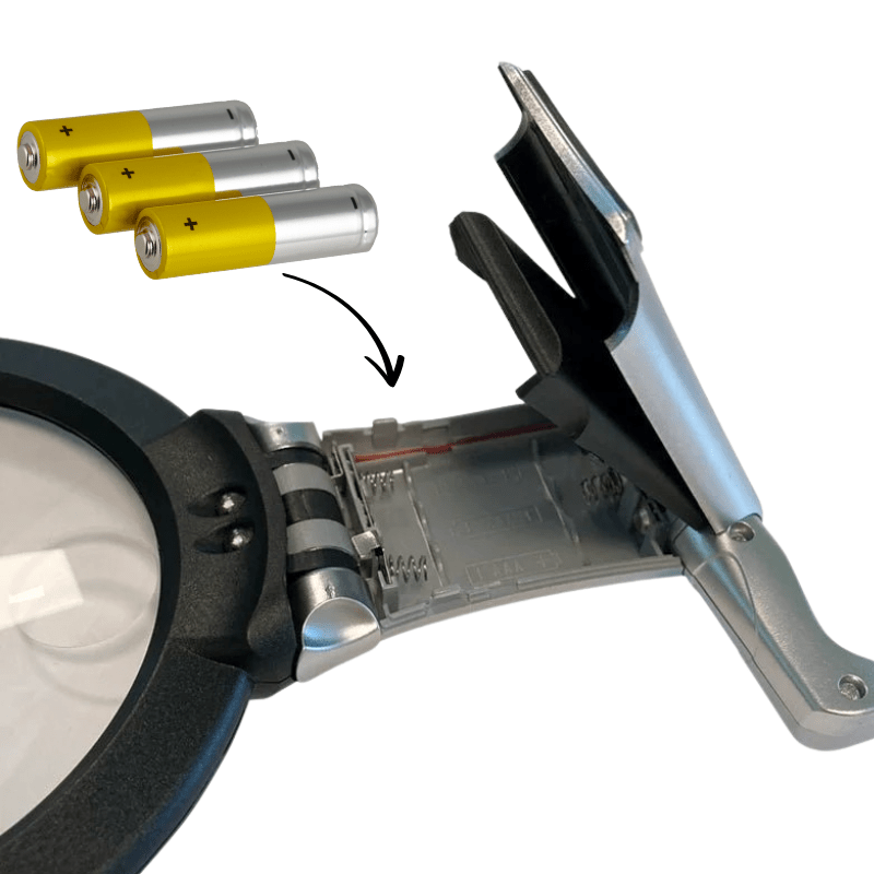 Auf der Rückseite des Vergrößerungsglases – unter den beiden LEDs – findest du die Klappe, auf die die Lupe gestellt wird. Dahinter befindet sich das Batteriefach. Indem du die Klappe oben anhebst, lässt sich das Batteriefach öffnen. Beim ersten Mal kann es etwas fest sitzen. Setze nun die Batterien ein und drücke die Abdeckung wieder fest zu.