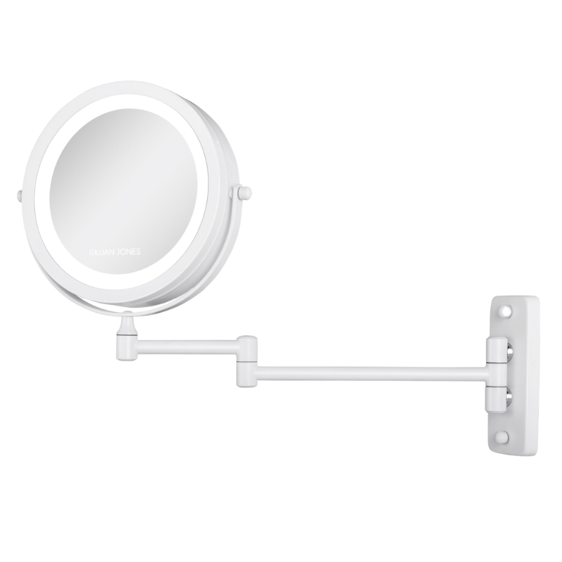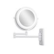 Flot væghængt makeup-spejl i hvid med dobbeltsiddet spejl der forstørrer 1x på den ene side og 10x på den anden. Spejlet har indbygget LED-lys med små dioder hele vejen rundt, så du kan se alle detaljer klart og tydeligt