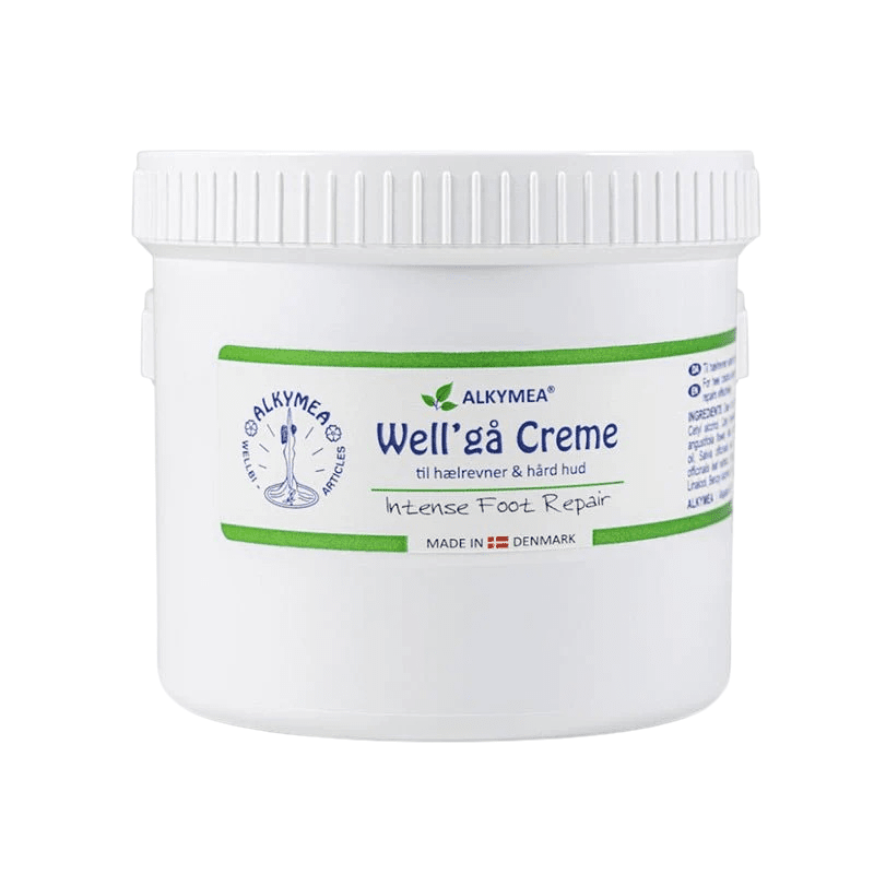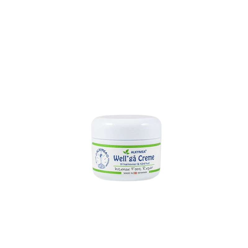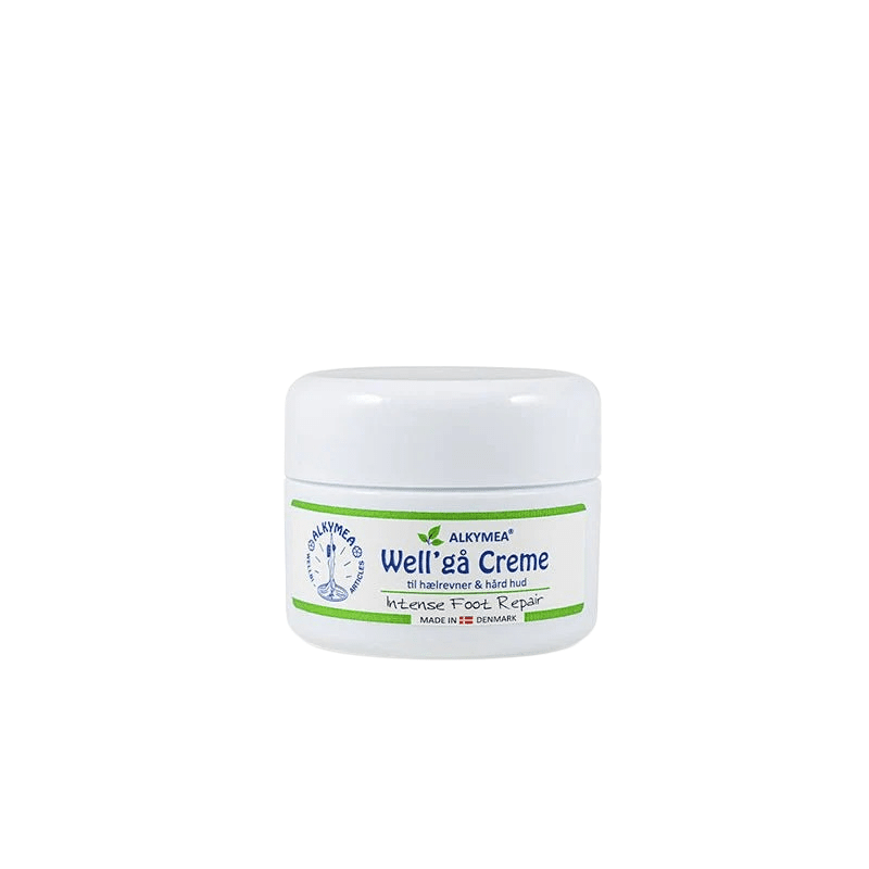 Well'gå er en fast salve med kamille og olivenolie til brug ved hælrevner, hård og tør hud på fødder, albuer og neglebånd.