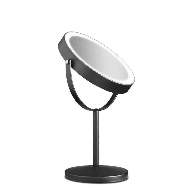 Wiederaufladbarer LED-Standspiegel mit integriertem, leistungsstarkem LED-Licht, das in drei verschiedenen Lichtnuancen eingestellt werden kann: warm, neutral und kalt. Über eine dezente Touch-Taste an der Seite steuerst du mühelos sowohl Ein/Aus als auch die Auswahl der Lichtfarbe und die Anpassung der Helligkeit mit der eingebauten Dimmfunktion.