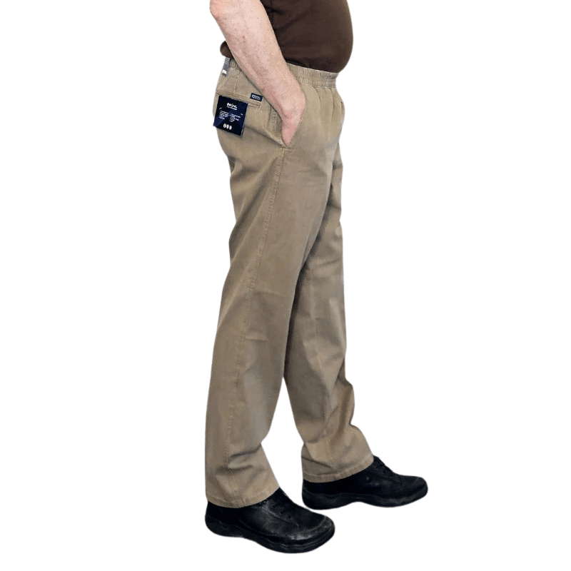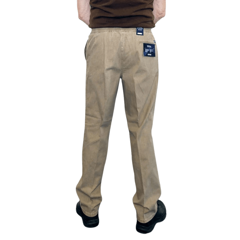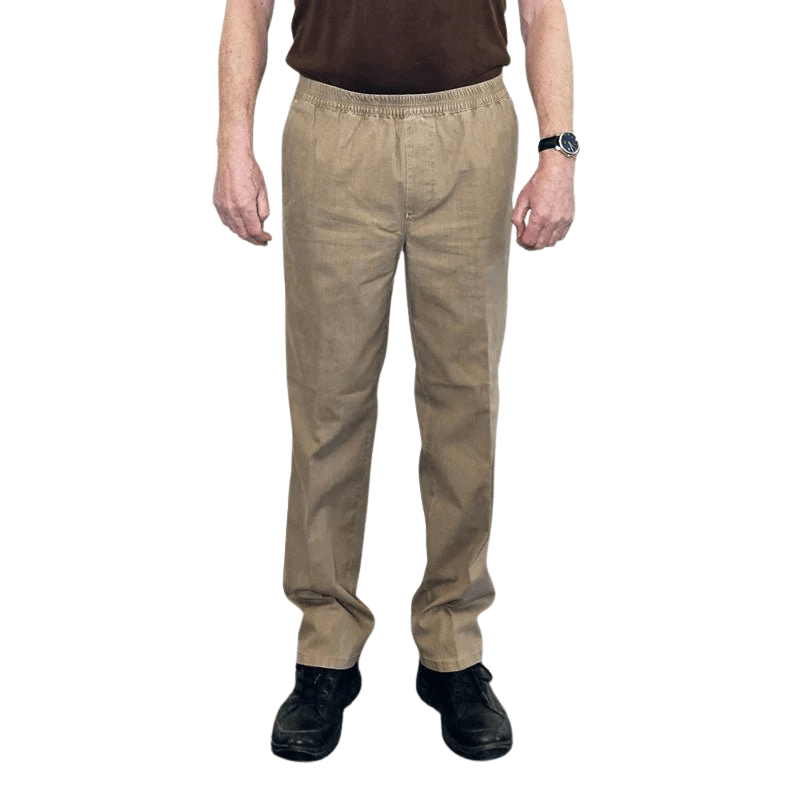 Diese klassischen Hosen überzeugen durch einen breiten, elastischen Bund und ein strukturiertes, leichtes sowie robustes Baumwollmaterial. Die warme Sandfarbe macht sie zum perfekten Begleiter für den Alltag und besondere Anlässe. Auf Reißverschlüsse oder umständliche Knöpfe wurde bewusst verzichtet – so kannst du die Hose ganz unkompliziert an‑ und ausziehen.