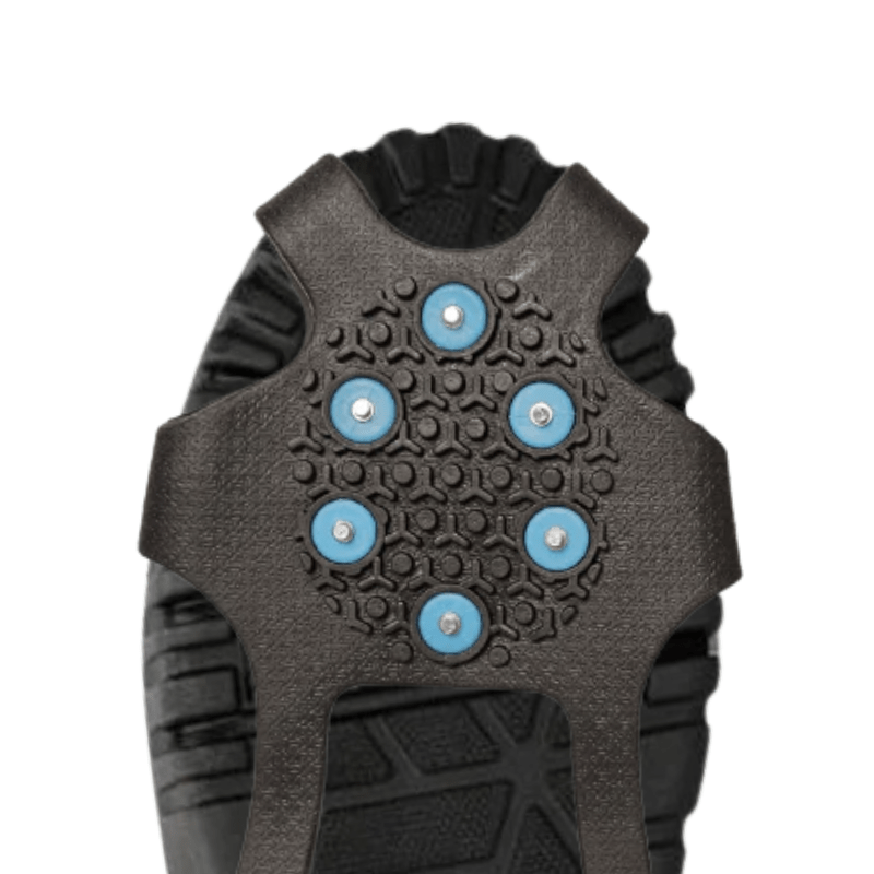 Unter der Greifhilfe befinden sich insgesamt zehn robuste Spikes aus gehärtetem Stahl, die einen effektiven Halt gewährleisten. Sechs Spikes sind unter dem Vorfuß und vier unter der Ferse platziert, was eine gute Balance und Stabilität bei jedem Schritt bietet.
